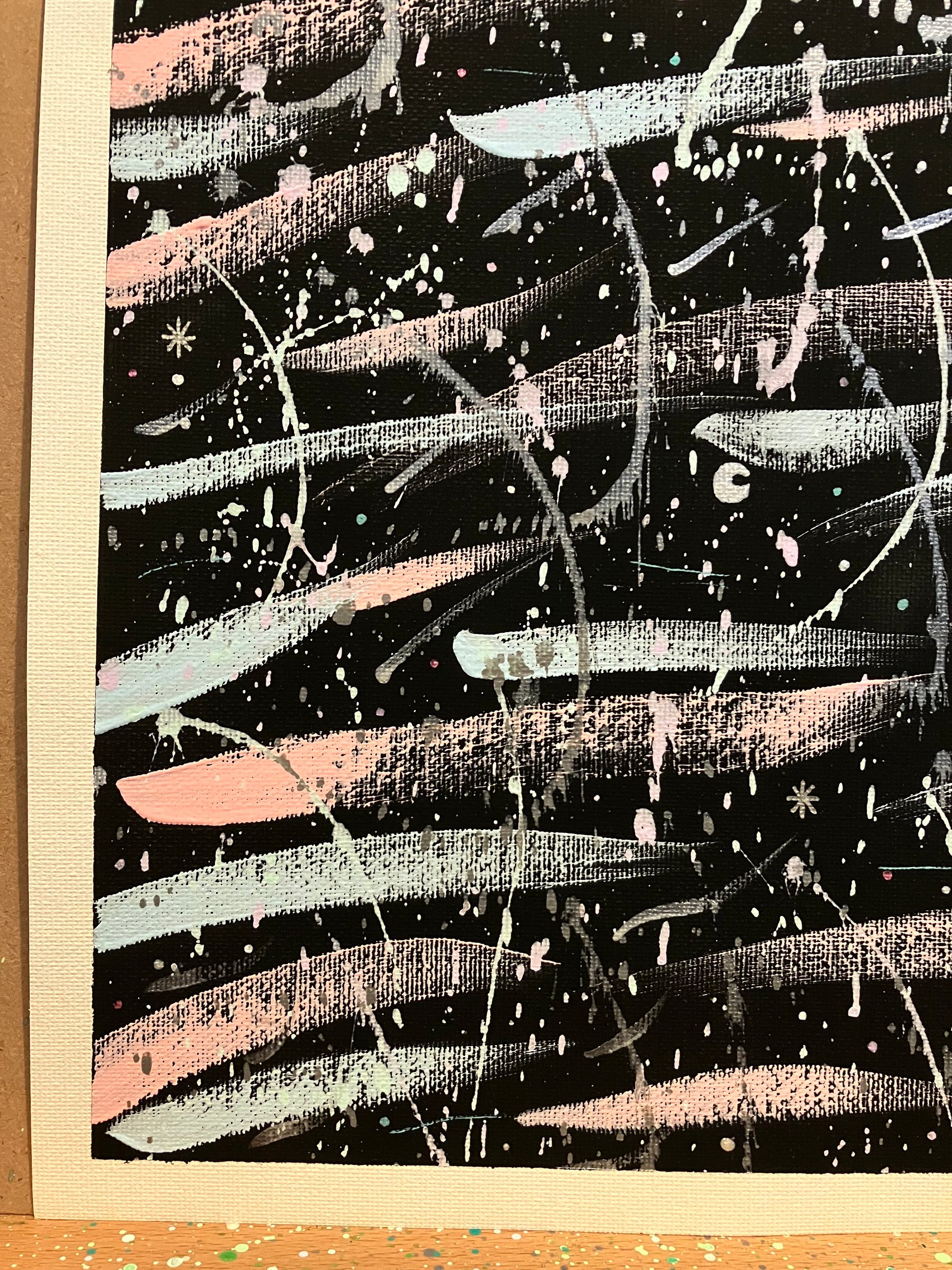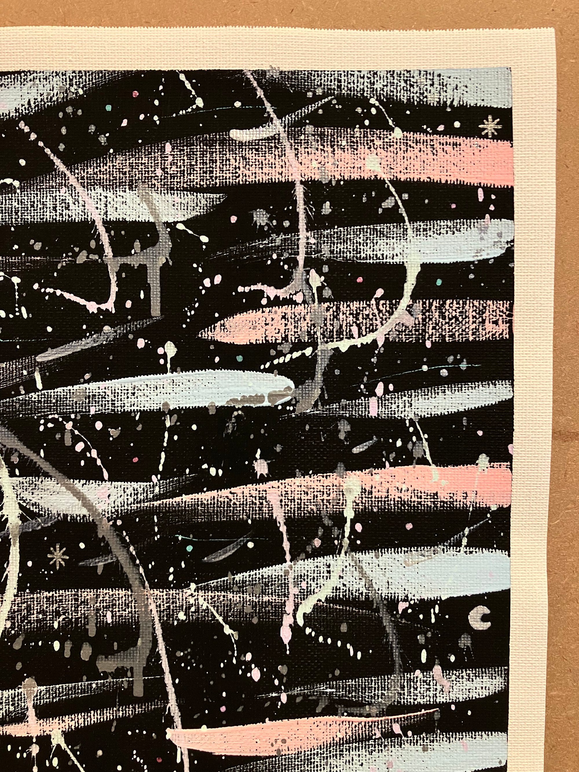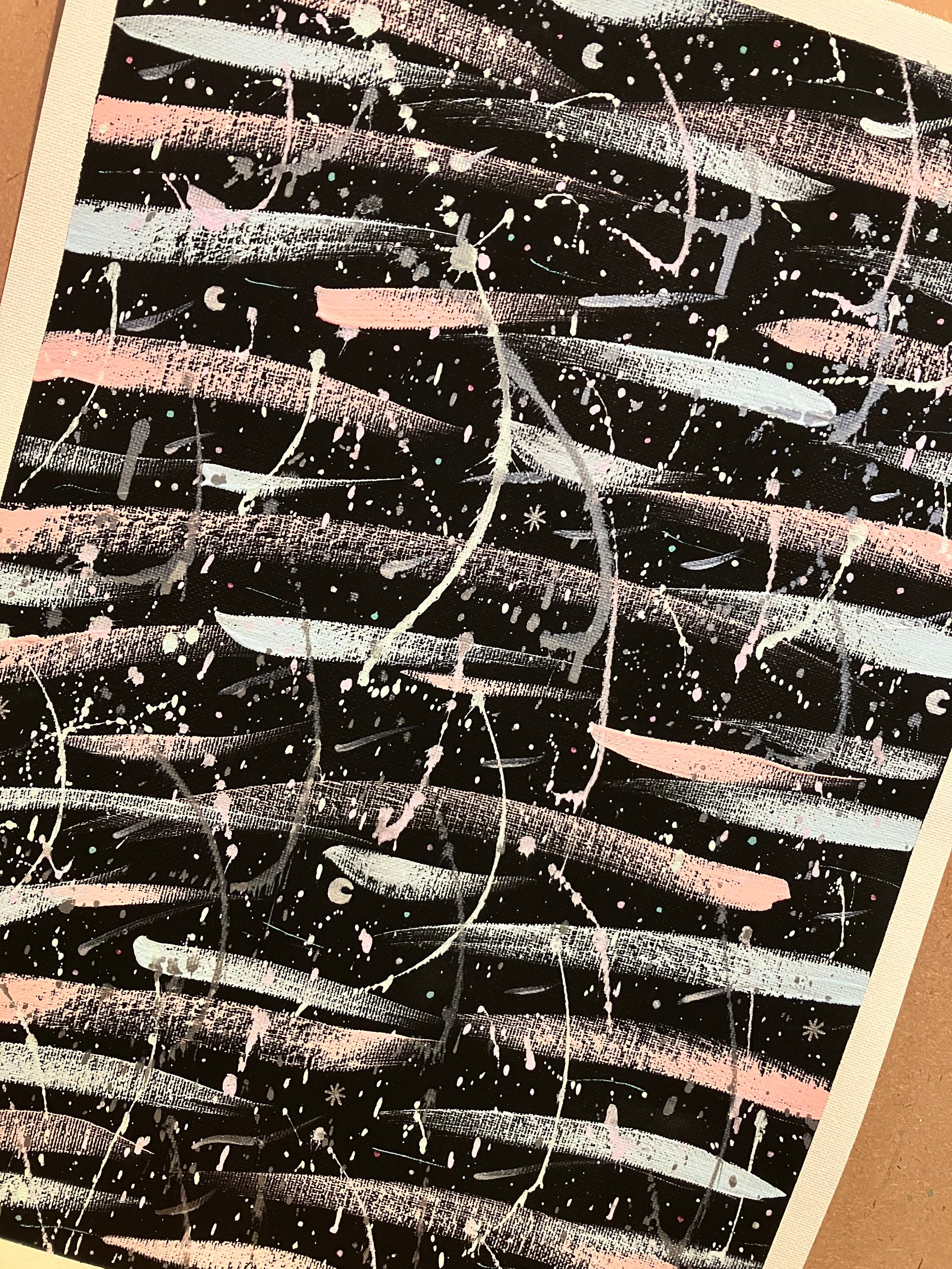 Black background with pastel blue and pink strokes, white and silver speckles and dashes, plus tiny moons and stars.