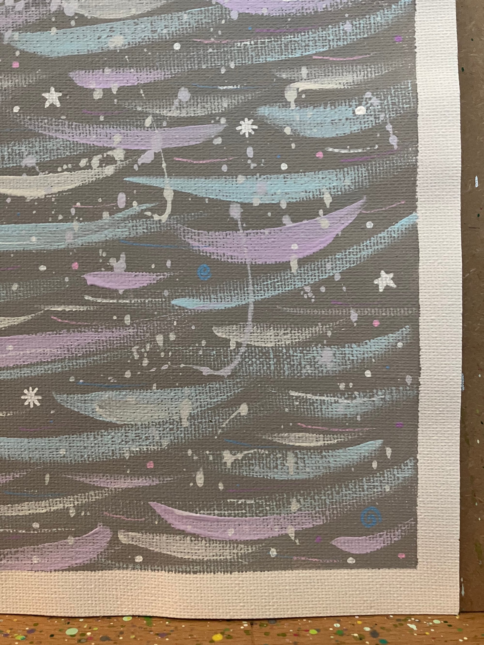 Soft grey background with pastel blue, purple and white strokes, and white speckles and dashes, plus tiny pastel dots, stars and swirls.