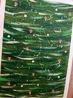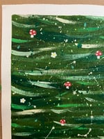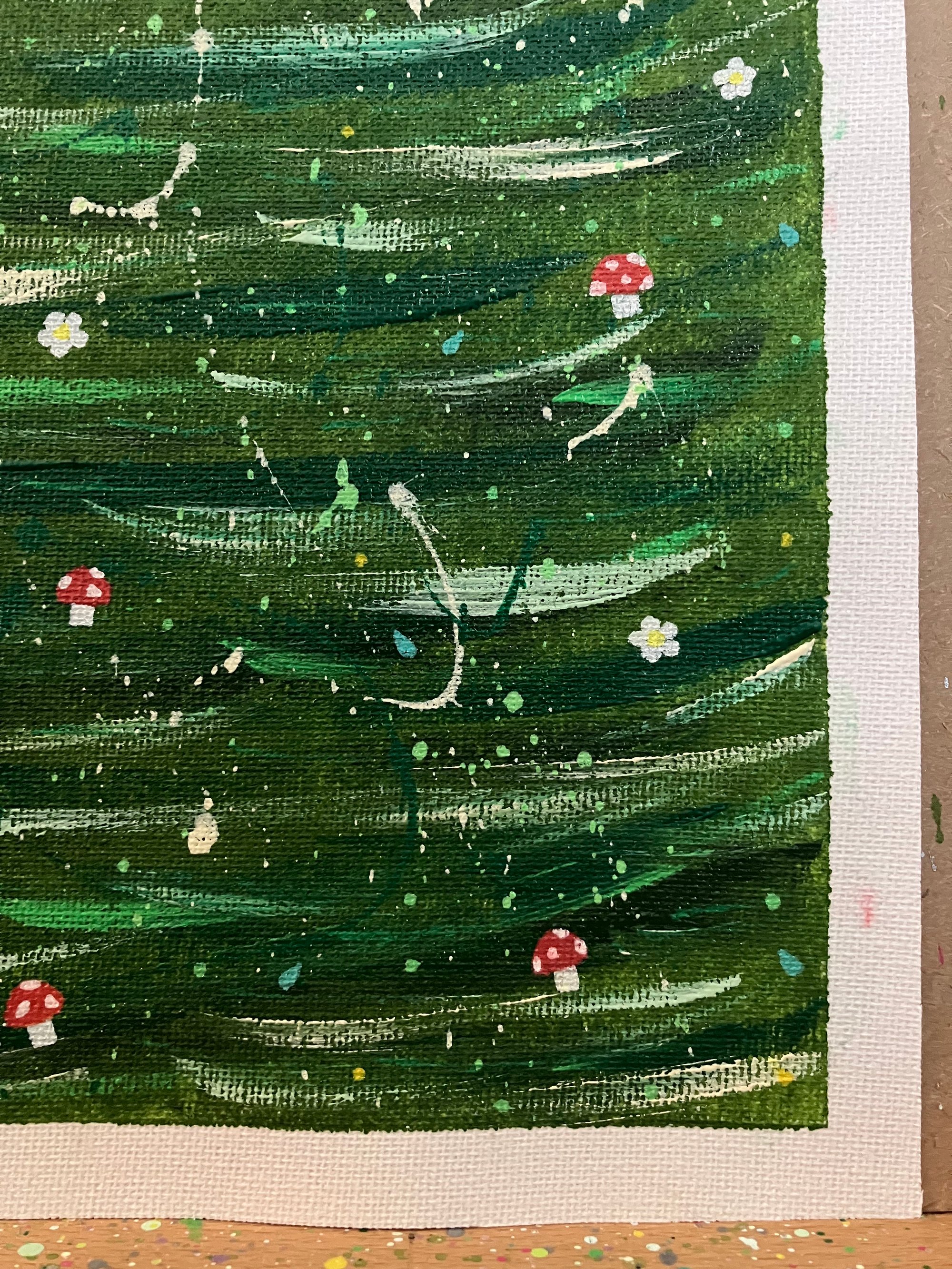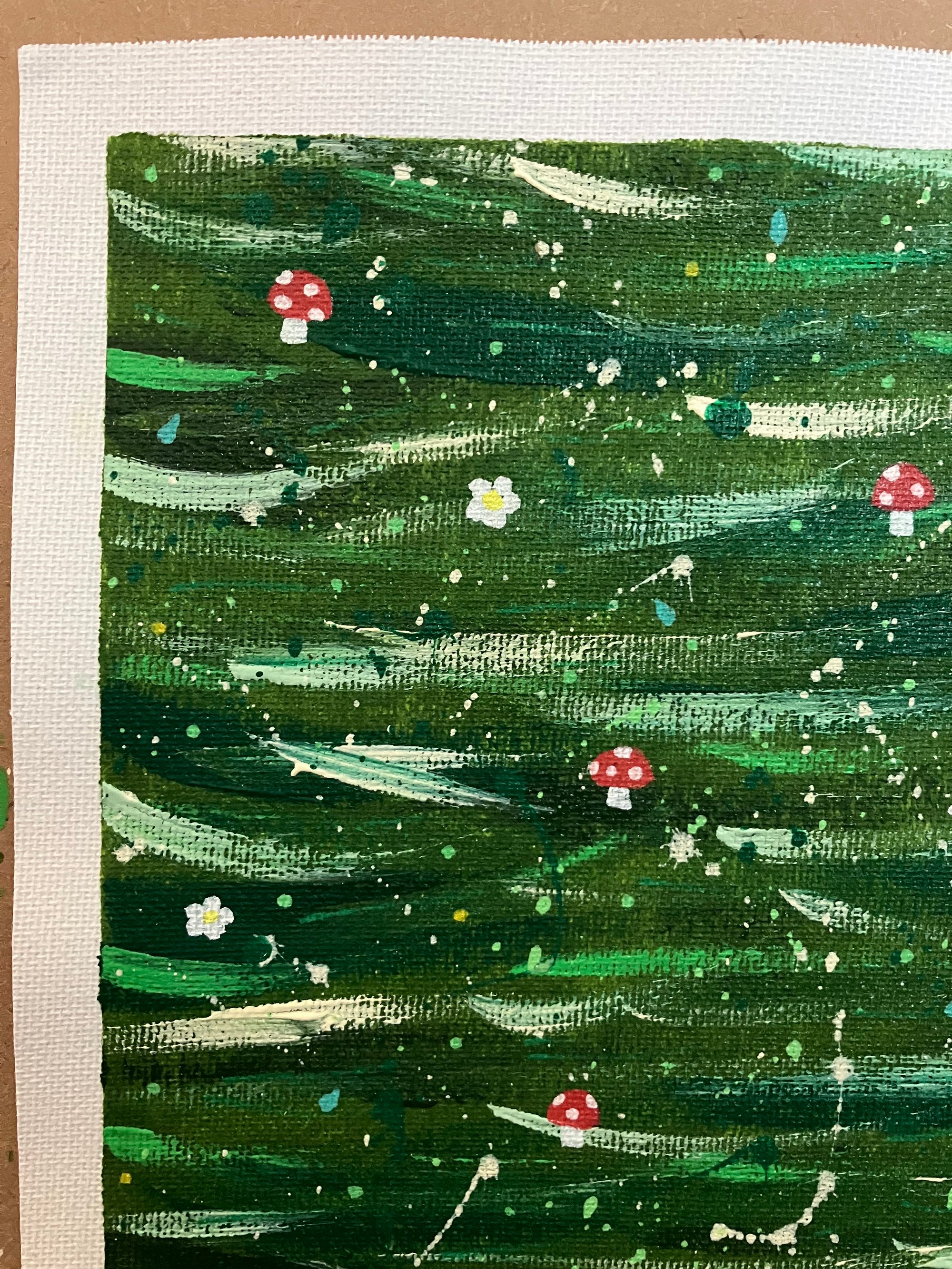 Olive green background with shades of green and cream strokes, forest green, cream and pastel green speckles and dashes, plus little mushrooms and tiny flowers and leaves.