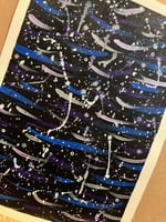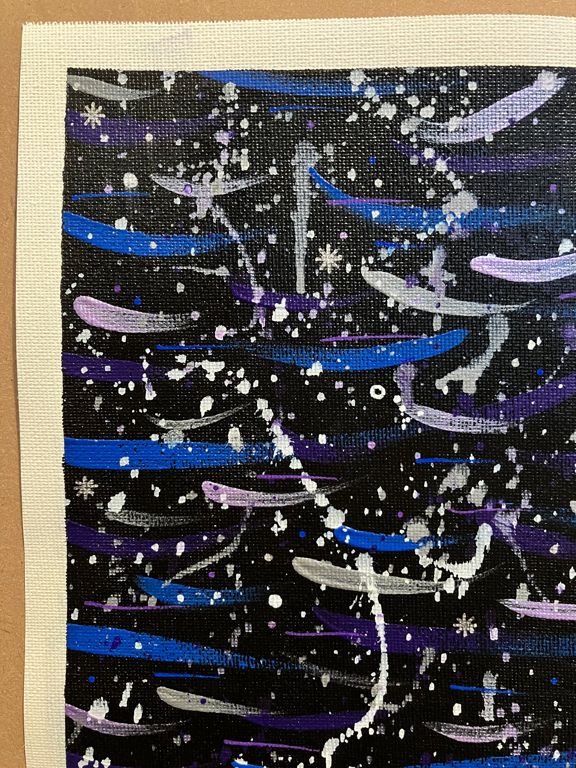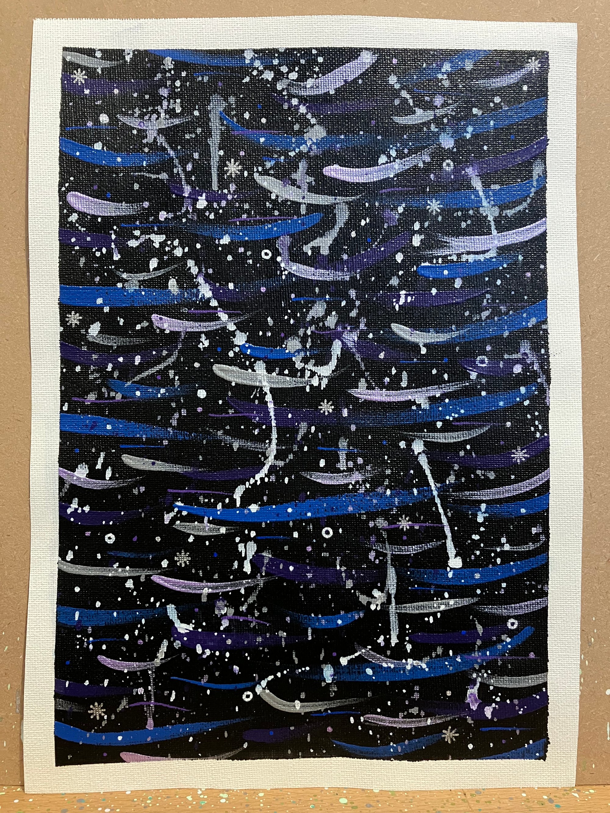 Black background with blue, purple, silver and metallic purple strokes, white and silver speckles and dashes, plus tiny circles and stars.